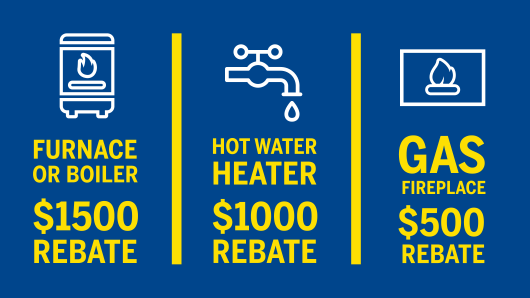 Get $1,500 back on a high efficiency natural gas furnace or boiler. Convert your hot water heater too and get an additional $1,000. Add the comfort of a natural gas fireplace and get $500 back. That’s up to $3,000 in rebates.